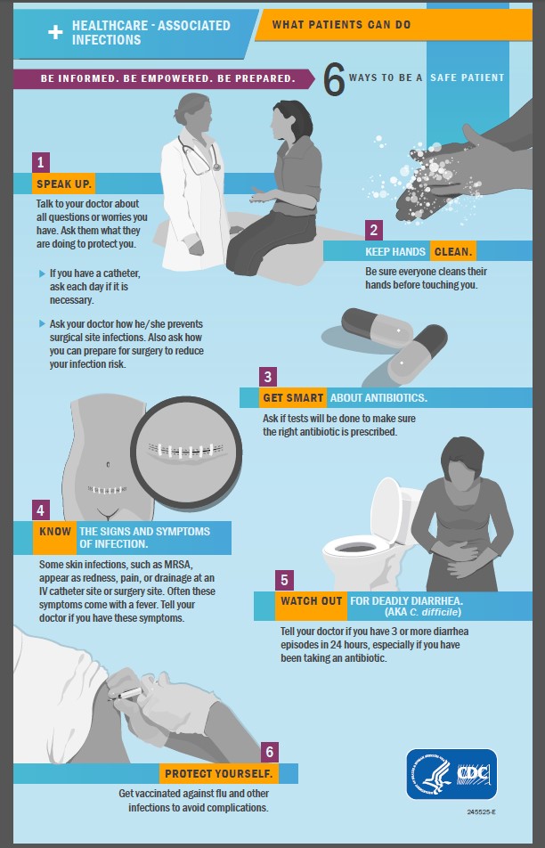 Nu-ți fie frică să vorbești cu medicul tău despre ceea ce te îngrijorează. Întreabă-l ce face ca să te protejeze. Dacă ai un cateter, întreabă în fiecare zi despre orice ți se pare suspect. Roagă medicul să îți explice cum trebuie să te pregătești pentru operație.