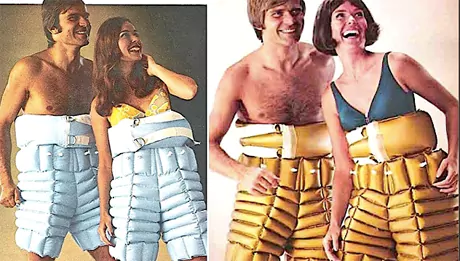 În perioada anilor 1970 au fost creați pantalonii scurți gonflabilli, care arătau ca un scutec de mărime mare. Ideea era simplă, purtarea acestora ducea la transpirție excesivă în zonă, în același timp oferea un tip de masaj unic prin buzunarele de aer atașate. În practică, lucrurile erau mai complicate. Pe lângă faptul că acești pantaloni scurți nu erau comozi de purtat, transpirația abundentă era destul de supărătoare. În plus, pierderea în greutate era nesemnificativă în comparație cu chinul pe care îl provocau acești pantaloni. Este un mit faptul că prin transpirație se pierde din grăsime. Acest mit a pornit de la faptul că atleții foloseau sauna pentru a pierde în greutate, însă această ,,slăbire” este foarte temporară, utilă pentru o seară. Este de ajuns să rehidratezi corpul corect și din nou revii la formele anterioare.