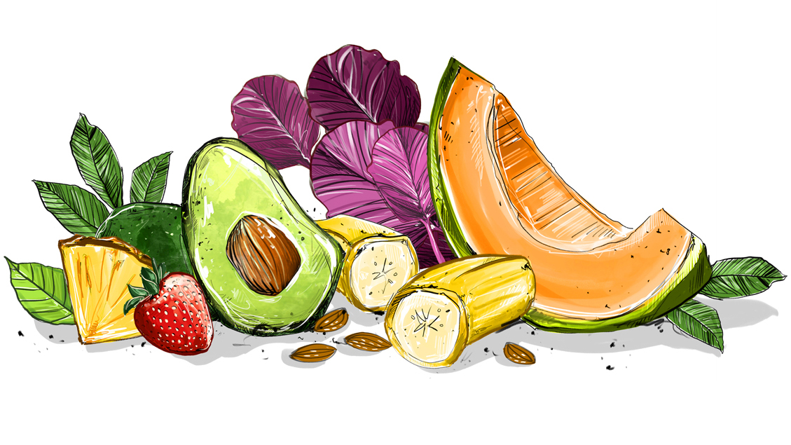 Cea mai importantă parte sunt, desigur, fructele și legumele proaspete, congelate, fierte, coapte sau uscate, 2-3 părți componente, la fel ca și nucile sau semințele crude sau germinate (1/2 sau ¼ parte componentă).