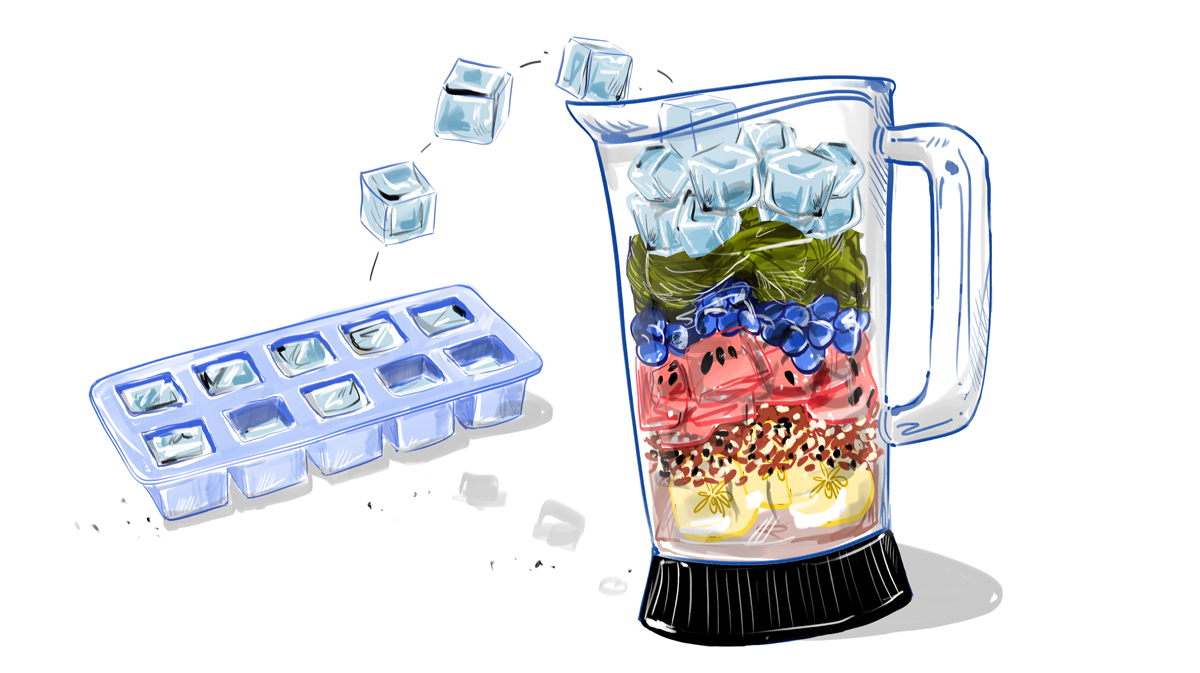 Gheața se pune la sfârșit pentru a ajuta la împingerea celorlalte ingrediente în jos, spre lame.