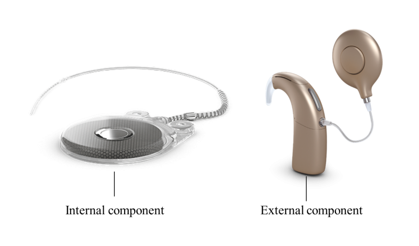 - Un implant cohlear intern cu un procesor de sunet extern care se montează în spatele urechii. Transmițătorul se atașează pe partea laterală a capului.