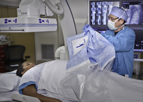 • va introduce un tub lung și subțire numit cateter peste ac și într-o arteră mare (de obicei în zona inghinală)