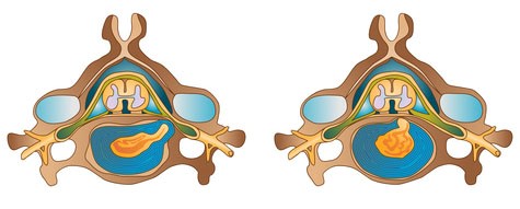 Discul intervertebral în proiecție: în imaginea din stânga hernia comprimă rădăcina, care iese din canalul intervertebral, prin orificiul care se numește foramen. În figura din dreapta, hernia comprimă rădăcina situată nemijlocit în foramen. Acestea sunt cazurile cele mai frecvente.