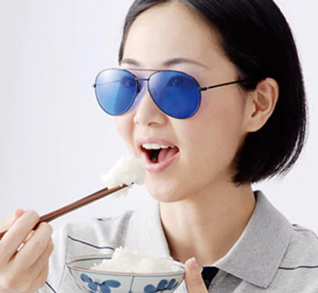 Aveți pofte necontrolate? Le puteți stăpâni doar cu ajutorul unei perechi de ochelari de soare albaștri. Albastrul este o culoare neapetisantă (aparent), ve-ți avea imediat controul asupra alimentelor pe care trebuie sau nu trebuie să le consumați. Ușor! Reclamele acestui produs erau destul de atractive, dar nu a fost atât de ușor precum afirmau comercianții. Chiar dacă într-adevăr s-au făcut studii care demonstrează că albastrul este neapetisant, ochelarii albaștri nu prea își fac efectul. Autodisciplina nutriției este un proces de ordin psihologic complicat, ochelarii albaștri nu sunt suficienți pentru a manipula cu creierul uman și mai ales cu mirosul și gustul mâncării.