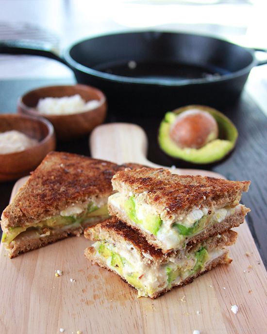 Încălzește la foc mediu o tigaie. Unge cu unt două felii de pâine, doar pe o singură parte. Pune în tigaie prima felie de pâine, cu partea unsă în jos. Acum începe să așezi în straturi, pe felia de pâine din tigaie, următoarele ingrediente: humus, bucățele de avocado cu sare și brânză feta sfărâmată între degete.